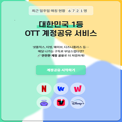 넷플릭스, 디즈니플러스, 티빙, 웨이브 등 다양한 OTT 서비스의 계정을 여러 사용자가 공유할 수 있도록 중개합니다. 계정공유를 통해, 혼자 이용시 부담하는 금액에 최대서 최대 70% 이상까지 저렴한 비용으로 OTT 서비스를 이용할 수 있습니다.
