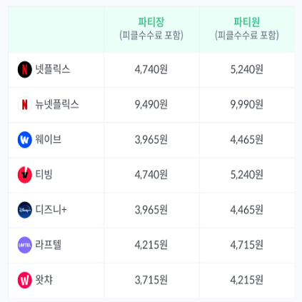 이용 요금은 파티장과 파티원이냐에 따라 파티장이 조금더 저렴하게 이용할 수 있으며, 파티장, 파티원 이냐에 따라 다소 장단점이 있지만, 편리하게 구성된 피클플러스 플렛폼 시스템을 이용하면 모두 무리없이 이용 가능합니다.