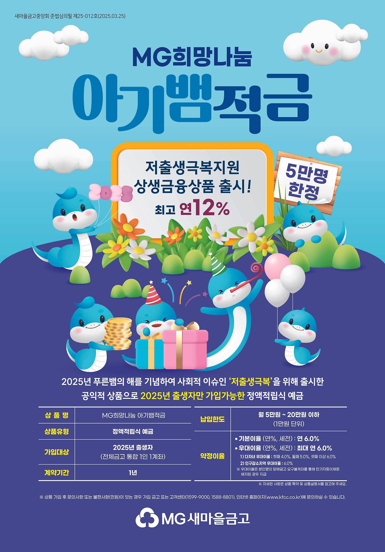 아기뱀적금은 새마을금고에서 제공하는 특별한 적금 상품으로, 2025년에 태어날 아기를 위한 금융 지원을 목적으로 하고 있습니다. 이 상품은 저소득 가정을 지원하고, 아기의 미래 자산 형성을 도와주는 역할을 합니다. 특히, 아기뱀적금은 최대 12%의 금리를 제공하여 많은 부모님들에게 큰 관심을 받고 있습니다.