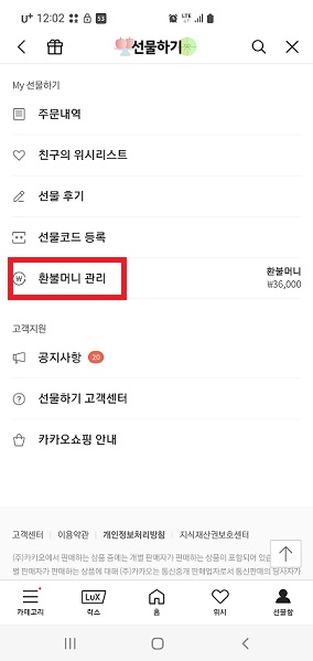 2. 선물함을 클릭하고 화면을 조금 내리다보면, 환불머니 관리 탭이 보입니다. 해당 글씨를 눌러 "환불머니 관리" 탭으로 이동합니다.