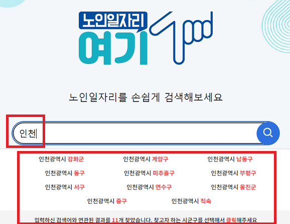 위 왼쪽 사진의 검색란에 자신의 거주 지역 (시/군/구) 를 적으면, 상세 지역정보가 나오고, 자신이 원하는 지역을 선택하면 오른쪽 그림과 같이, 자신이 선택한 지역에 올라온 구인 공고를 확인해 볼 수 있습니다.