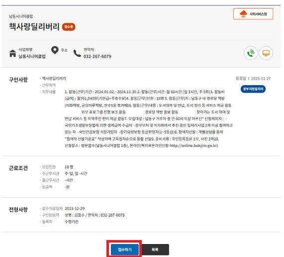 관심있는 구인 공고를 선택하면, 위와 같이 상세 구인 내용이 나오고, 마음에 들게 되면 접수하기 버튼을 누르면 손쉽게 해당 일자리 신청이 완료 됩니다.