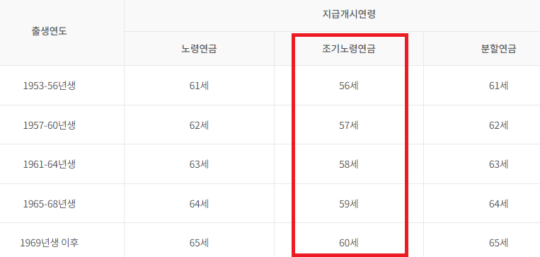 국민연금을 지급하는 연령 기준은 아래 표와 같습니다. 조기 연금 신청 조건은 기본 국민연금 보다 각 출생연도 기준에서 5살 적은 연금 나이에 국민연금 수급이 가능한 것을 확인할 수 있습니다.